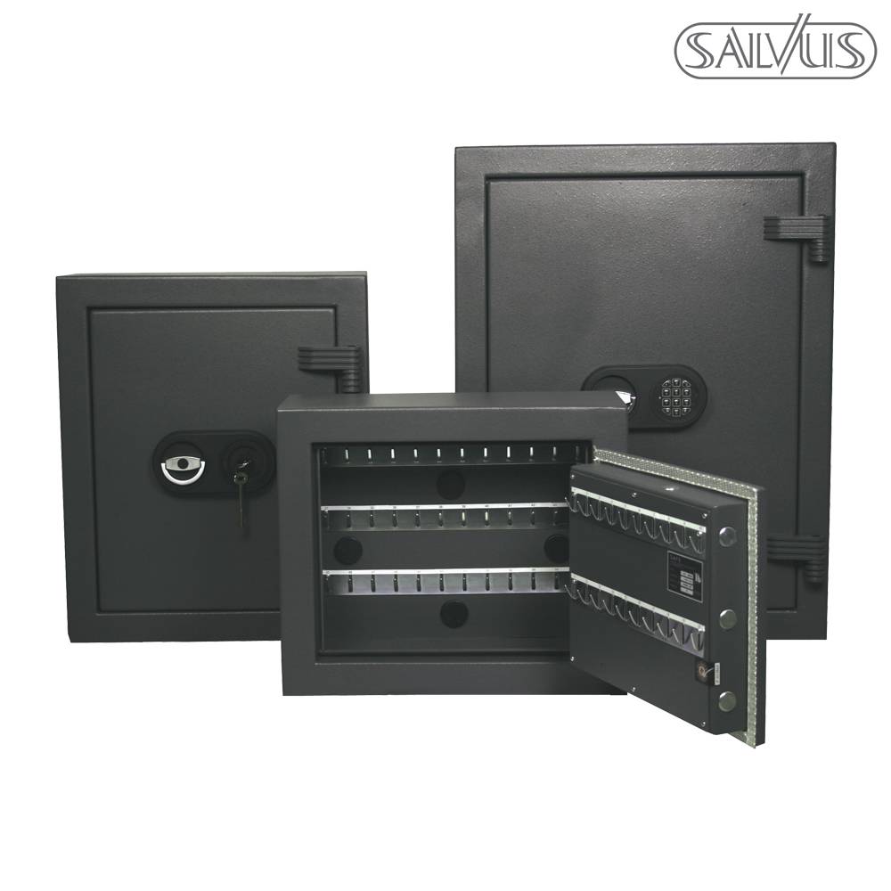 Salvus sleutelkluis. Bescherming tegen inbraak en brand . Gecertificeerde inbraakwerendheid volgens EN 1143-1 Grade 0. Indicatie waardeberging:€ 7.000 (contant geld) of € 14.000 (kostbaarheden) Standaard uitgevoerd met: EN 1300 gecertificeerd sleutelslot met 2 sleutels of EN 1300 gecertificeerd elektronisch slot (incl. batterijen)